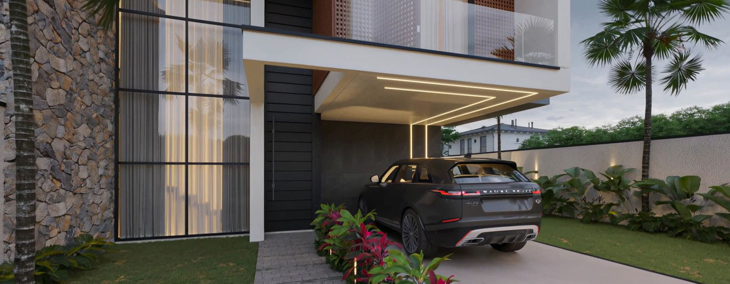 A Casa 01 foi criada para quem busca integração total. Living, cozinha e área gourmet se conectam sem barreiras, criando um fluxo natural para receber e conviver. A área íntima mantém o equilíbrio com suítes bem dimensionadas, enquanto a área externa traz frescor e momentos de contemplação.